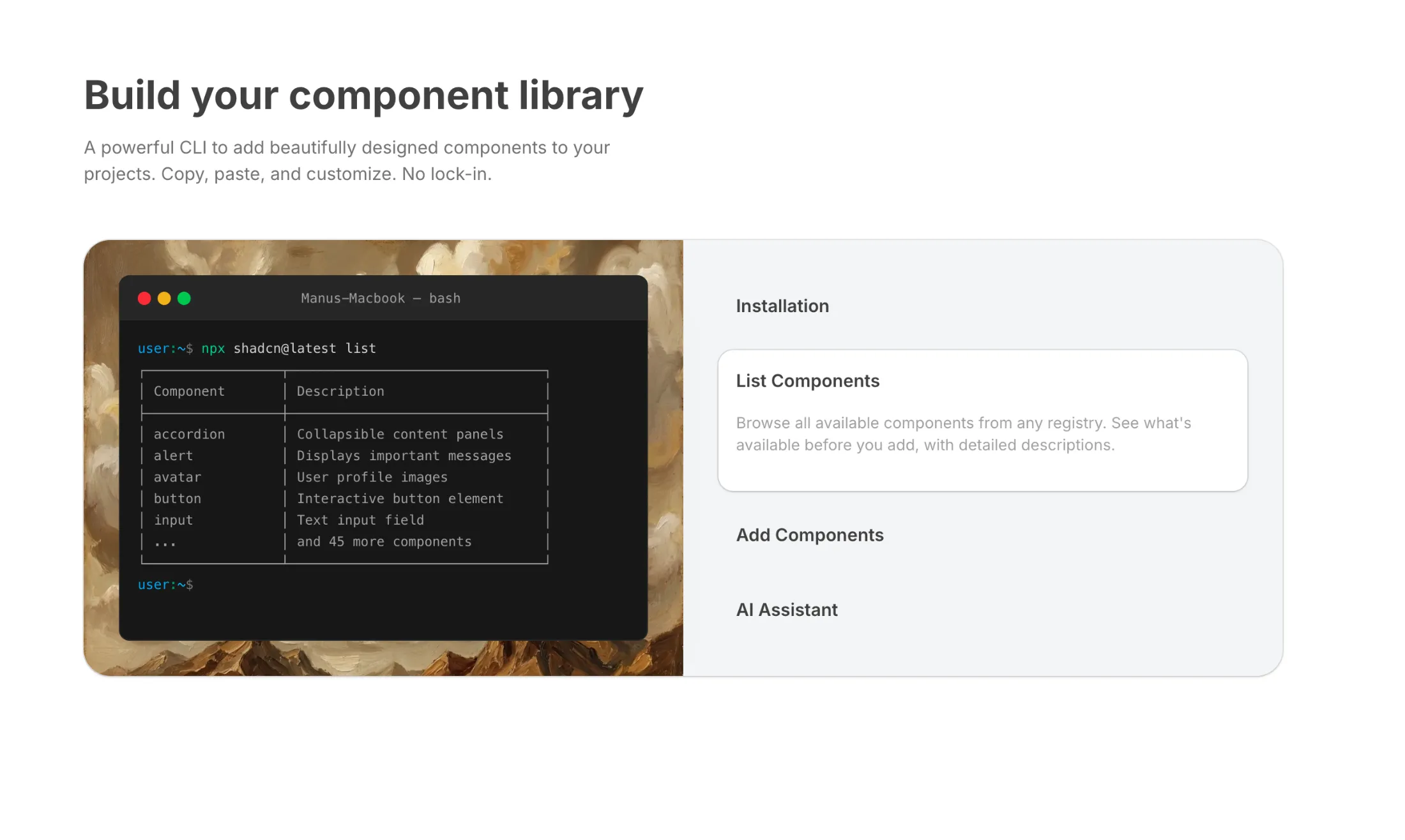 The background features a horizontal masonry grid with 5 rows of component screenshots at staggered offsets. A radial gradient mask fades the images toward the center, keeping the hero content readable while adding visual depth.